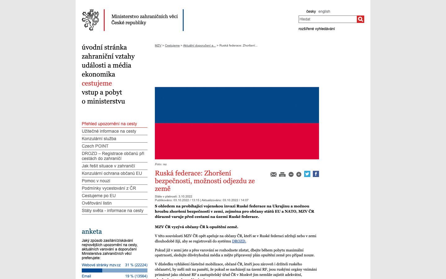 Министерство иностранных дел Чехии призвало граждан республики, находящихся в России, покинуть страну из-за возможного ухудшения ситуации в сфере безопасности в связи с войной в Украине.