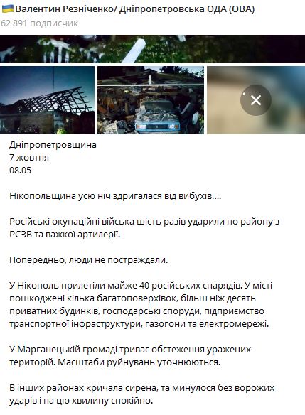 Никопольский район Днепропетровской области армия РФ обстреляла трижды за ночь 7 октября. Обстрелы велись из РСЗО и тяжелой артиллерии.
