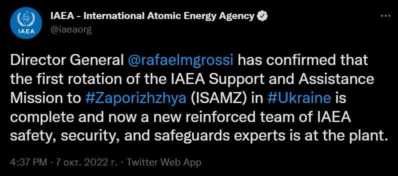 "Гендиректор Рафаэль Гросси подтвердил, что первая смена персонала миссии поддержки и помощи МАГАТЭ на Запорожской АЭС в Украине завершена, и теперь новая усиленная команда экспертов МАГАТЭ по безопасности находится на станции", - говорится в Twitter МАГАТЭ.