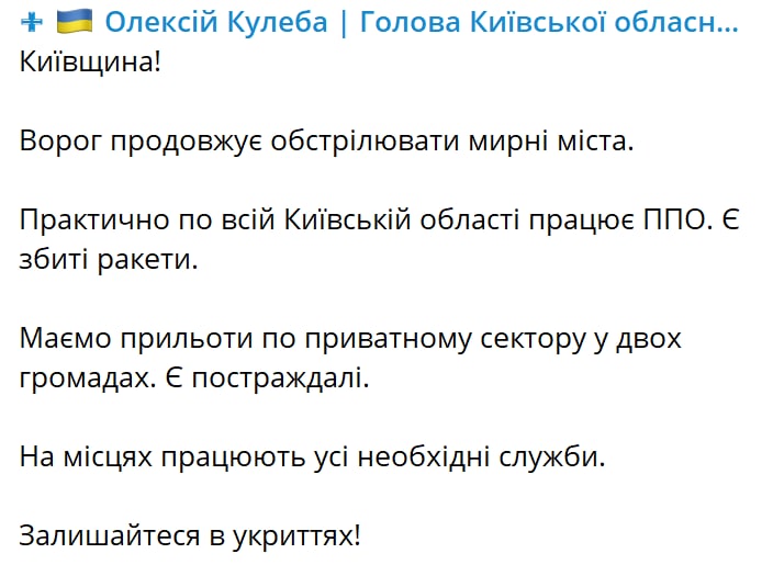 Ракеты поразили объекты в центре города (в Шевченковском районе) и Соломенском районе. Он попросил во время тревоги находитесь в укрытиях.