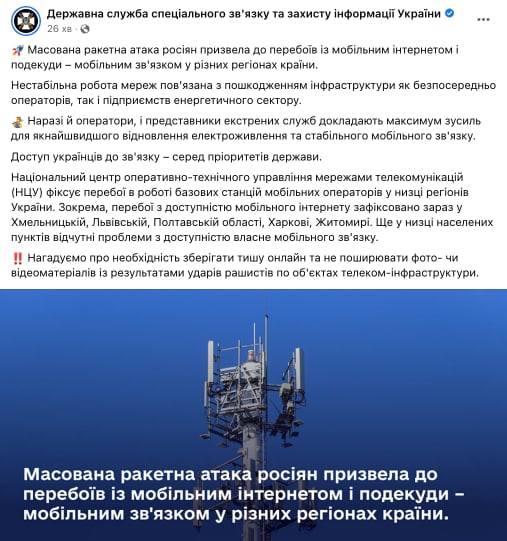 1. Президент рассказал о том, как идет восстановление инфраструктуры, пострадавшей утром во время обстрелов. По его словам, в Харьковской области восстановлено электричество на 50%, а через несколько часов восстановят почти везде. В Полтавской и Хмельницкой областях уже восстановили почти везде, Николаевская, Одесская и Черкасская подключены. В Киевской, Черниговской, Сумской, Львовской, Днепропетровской и Тернопольской областях, а также в Киеве - работают.