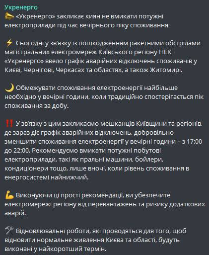 "Сегодня и, возможно, в несколько следующих дней все же понадобится дополнительное ограничение потребления, чтобы дать возможность нашим ремонтным бригадам, которые работают 24/7, восстановить электросеть и как можно скорее обеспечить надежное электроснабжение", - сказал он.