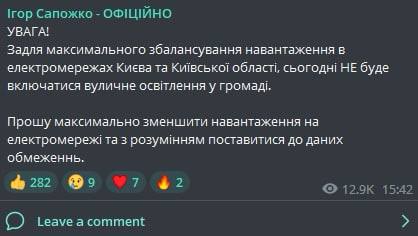 Он пишет, что свет обещают дать к 24:00.