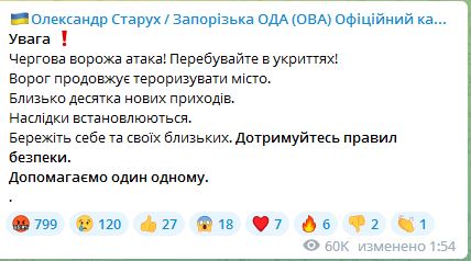 02.00 В Запорожье около 10 прилетов ракет РФ. Об этом сообщил глава области Александр Старух.