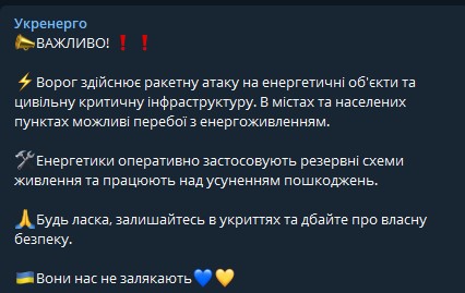 "Враг совершает ракетную атаку на энергетические объекты и гражданскую критическую инфраструктуру. В городах и населённых пунктах возможны перебои с энергопитанием.