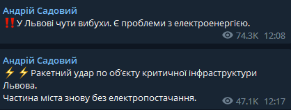 Он уточнил, что взрывы - это ракетный удар по объекту критической инфраструктуры Львова. В связи с этим часть города снова осталась без электроснабжения.