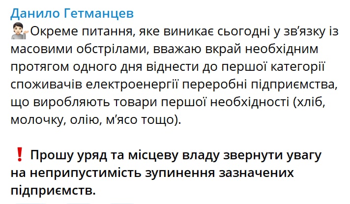 08.45 Депутат Данил Гетманцев предлагает запретить отключения света на предприятиях, которые производят товары первой необходимости - хлеб, молочку, масло, мясо и так далее.