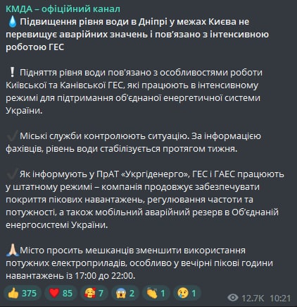 10.30 Власти Киева подтвердили повышение уровня воды в Днепре, о котором ранее писали в соцсетях.