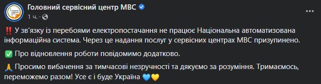 10.42 Из-за перебоев с электричеством не работает Национальная автоматизированная информационная система, сообщают в МВД.
