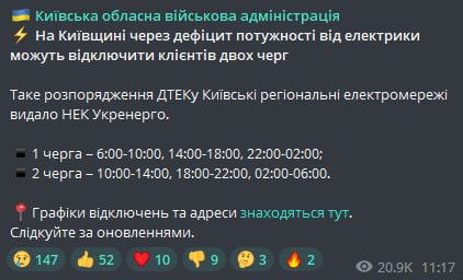 10.20 Из-за дефицита энергомощностей ДТЭК "Киевские электросети" отключают электроснабжение всех трех очередей потребителей.