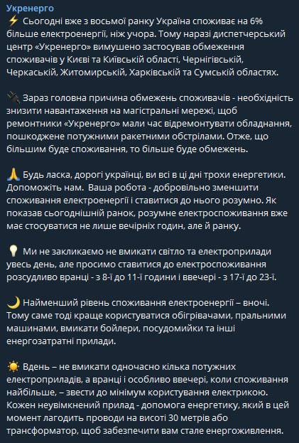Сегодня вечером велика вероятность, что нам не придется вводить принудительные ограничения потребителей в этих регионах», – говорится в сообщении компании в ее тг-канале.