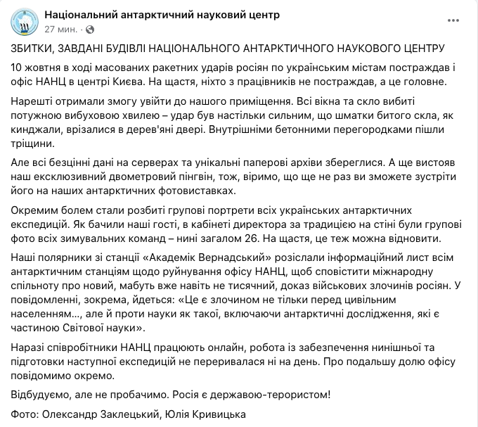В результате массированных обстрелов 10 октября пострадал и офис Национального антарктического научного центра, который расположен в центре Киева. Никто из сотрудников не пострадал.