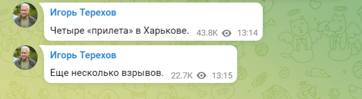 Мэр Харькова Игорь Терехов пишет о ракетных ударах по городу днем в пятницу, 14 октября. Зафиксировано минимум четыре прилета и еще несколько взрывов.