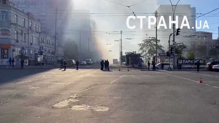 После атаки дронов-камикадзе в Киеве продолжает гореть дом. Движение на улице Жилянской перекрыто. Видео