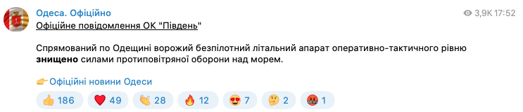 Над морем в районе Одессы силами ПВО сбили беспилотный летательный аппарат РФ оперативно-тактического уровня.