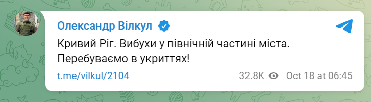 Утром во вторник, 18 октября, взрывы прогремели в северной части Кривого Рога.