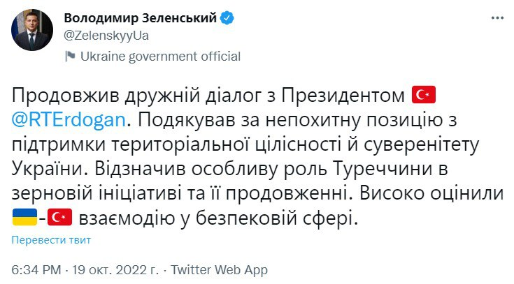 "Поблагодарил за твердую позицию по поддержке территориальной целостности и суверенитета Украины. Отметил особую роль Турции в зерновой инициативе и ее продлении", – сообщил президент Украины.
