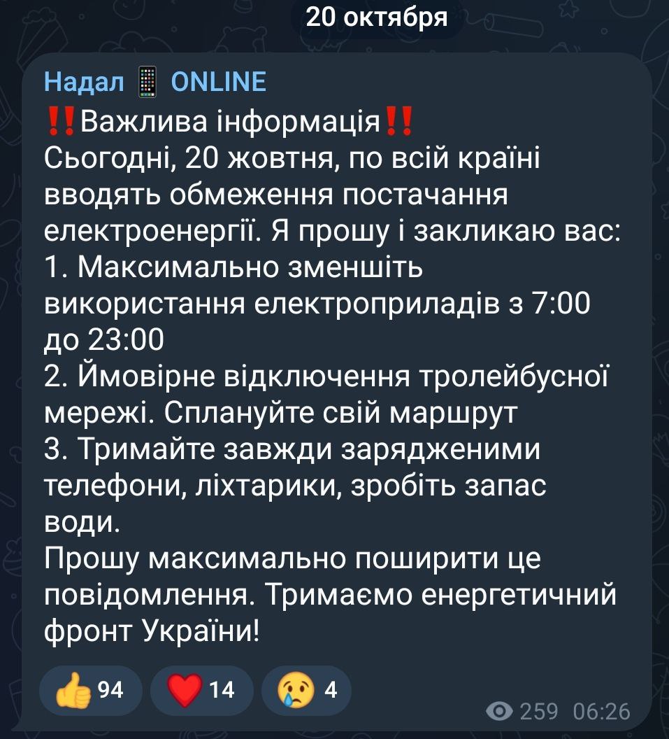 07:05 В Киевской области призвали максимально ограничить потребление энергии с 7 часов утра и до 23-х вечера.
