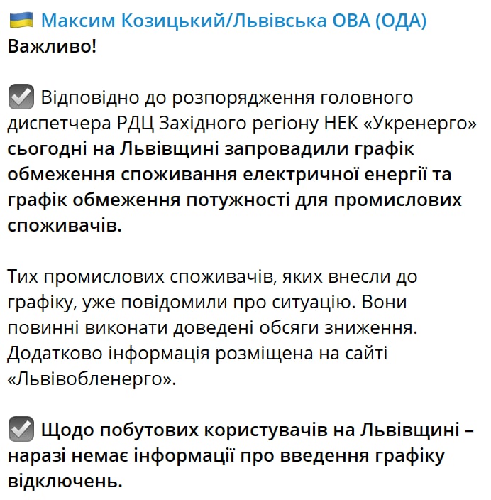 09:50 Во Львовской области сегодня отключили свет для промышленности. Обычных потребителей это пока не коснулось, сообщил губернатор Максим Козицкий.