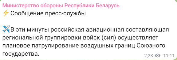11:14 Минобороны Беларуси заявляет, что российская авиация в эти минуты «осуществляет плановое патрулирование воздушных границ Союзного государства».