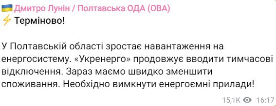 "Я понимаю, что это тяжело и тепла в ваших домах КП "Полтаватеплоэнерго" не дало, и вы пользуетесь обогревателями. Но давайте выключать хотя бы один потребитель электроэнергии. И тем самым мы внесем большой вклад в сокровищницу нашей победы", - заявил мэр Полтавы.