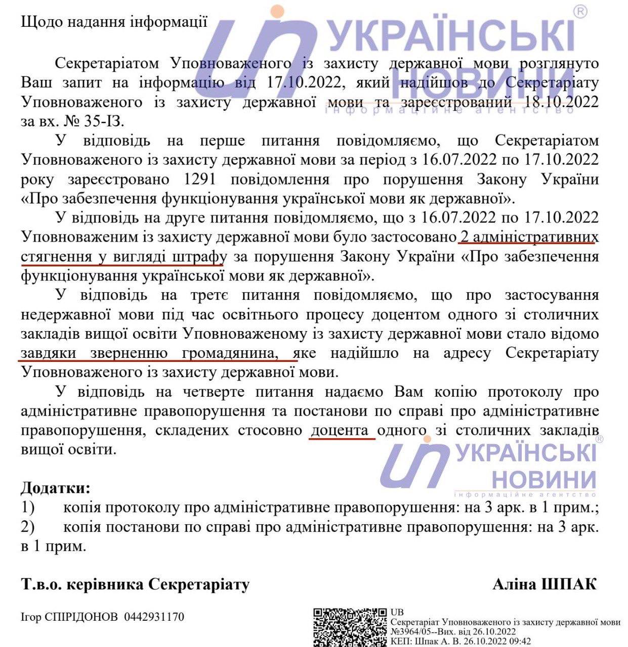 В ответе на запрос "Украинских Новостей" Секретариат омбудсмена подтвердил, что о нарушении доцентом языкового закона стало известно благодаря "обращению гражданина".