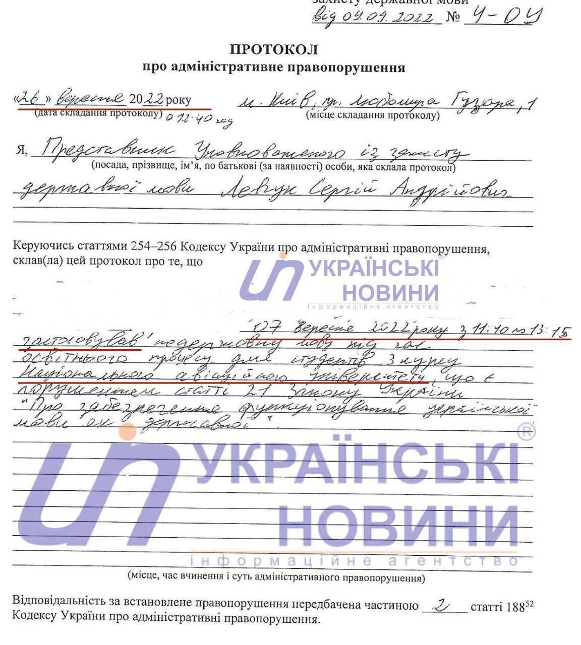 Издание получило копии протокола и постановления о штрафе преподавателя. Из них следует, что 7 сентября доцент НАУ на 2 парах для студентов 3 курса использовал негосударственный язык. В каком объеме и какой именно, русский или иной, не уточняется.