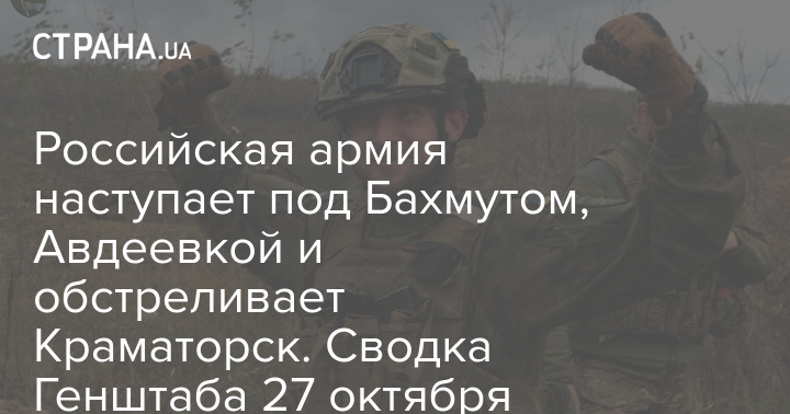 В Генеральном штабе Вооруженных сил Украины опубликовали оперативную сводку с фронта по состоянию на 18:00 27 октября. Сообщается, что россияне продолжают наступать под Бахмутом и Авдеевкой, обстреливают Краматорск.