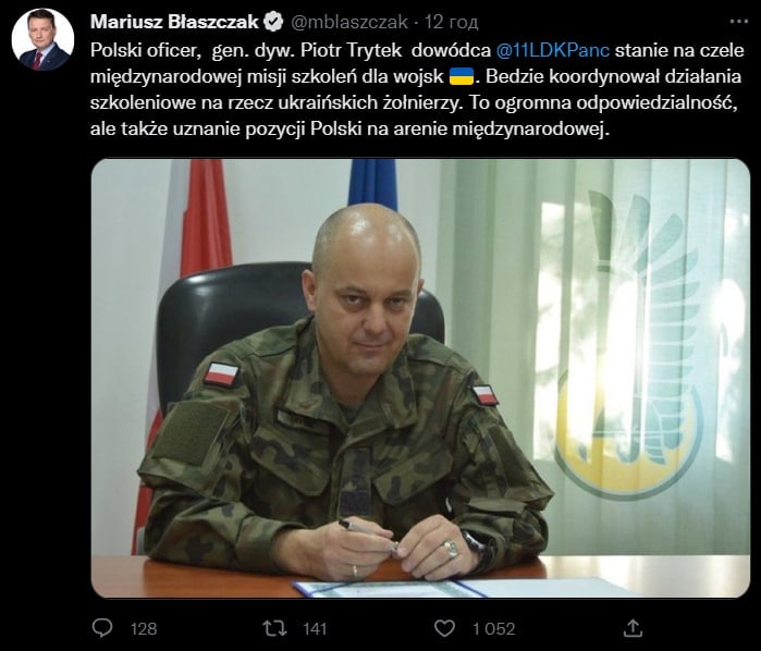Командующим миссией Евросоюза по обучению украинских военнослужащих назначен польский генерал-майор Петр Тритек, сообщил министр обороны Польши Мариуш Блащак
