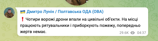 Полтавский губернатор Дмитрий Лунин подтвердил удары четырех вражеских дронов, которые упали на объекты гражданской инфраструктуры. Там начался пожар (на видео). Три дрона удалось сбить.