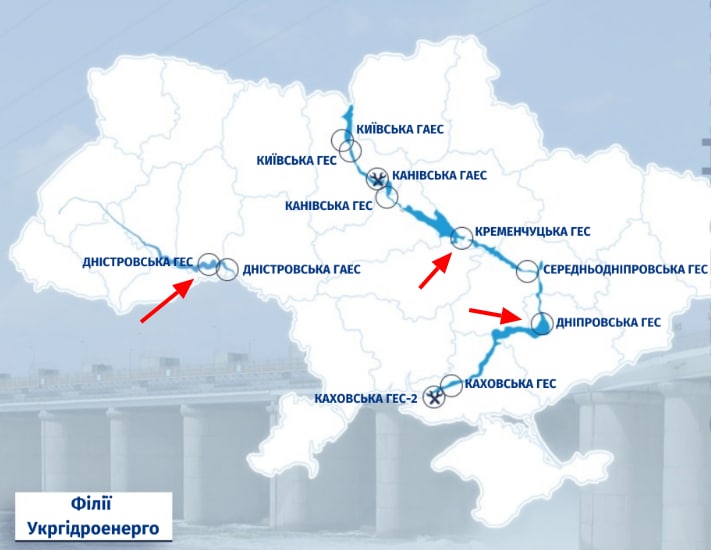 Отметим, что, судя по информации об ударах, они пришлись (помимо трех названных выше ГЭС) также в район Канева в Черкасской области (где находится Каневская ГЭС), а также в район Вышгорода (где находится Киевская ГЭС).