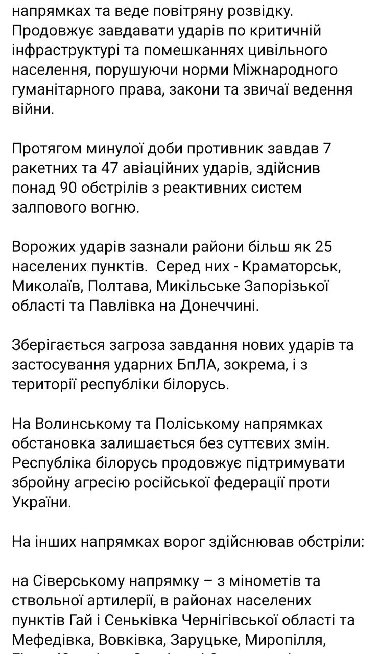 3. От ракетных обстрелов и ударов БПЛА за сутки больше всего пострадали Краматорск, Николаев, Полтава, Никольское Запорожской области и Павловка Донецкой области.