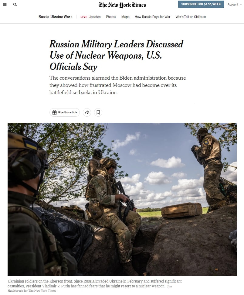 12.30 Руководство РФ обсудило применение ядерного оружия в Украине, пишет New York Times со ссылкой на официальные лица США.