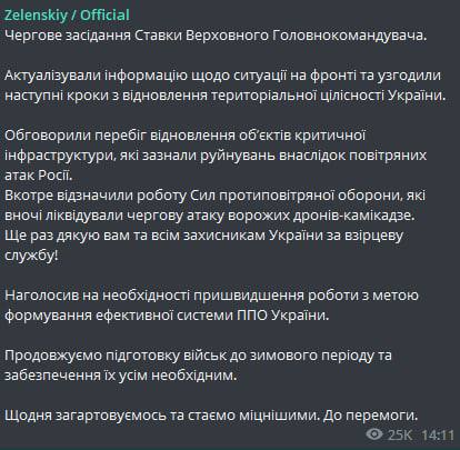 - Сообщил о новом заседании ставки верховного главнокомандующего, где обсуждались сражения на Донбассе и других направлениях.