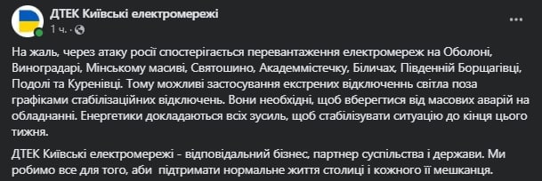 18.25 В Киевской области вновь начались экстренные отключения электроэнергии.