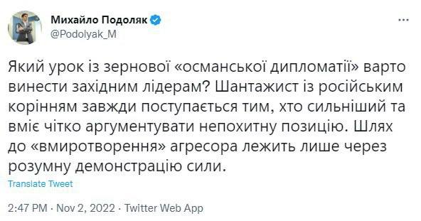 Ранее МИД России заявил, что Украина должна предоставить гарантии неиспользования гуманитарного коридора в Черном море в военных целях.