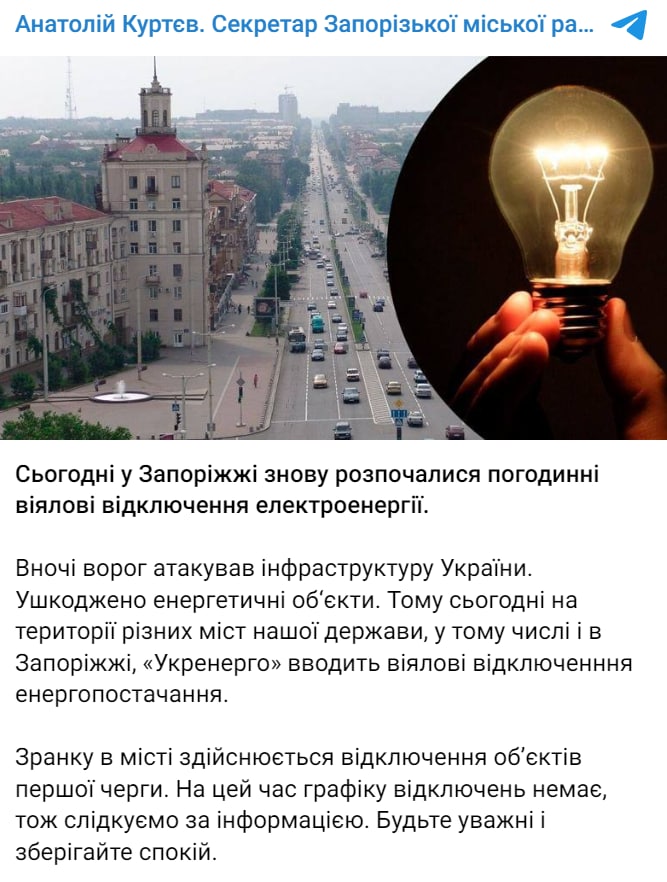 7:49 Из-за ночных ударов по объектам энергетики, в Запорожье с утра вводятся веерные отключения света.