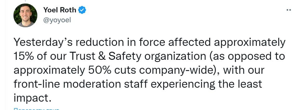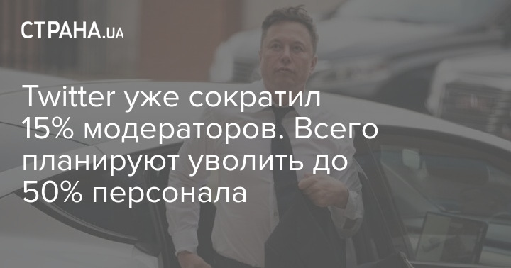Купленный Илоном Маском "Твиттер" сократил 15% модераторов. По всей компании в целом ожидаются сокращения до 50% персонала, заявил глава одного из отделов Юэл Рот.