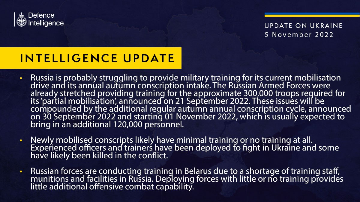 При этом, по мнению разведки, эти проблемы будут усугубляться из-за регулярного осеннего призыва, начавшегося 1 ноября, в рамках которого, как ожидается, будут привлечены дополнительно 120 000 военнослужащих.