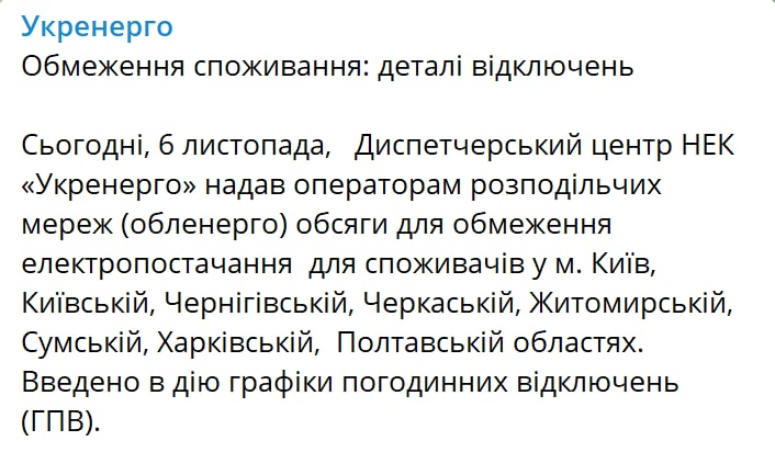 21:57 "Укрэнерго" публикует детали отключений света завтра, 7 ноября.