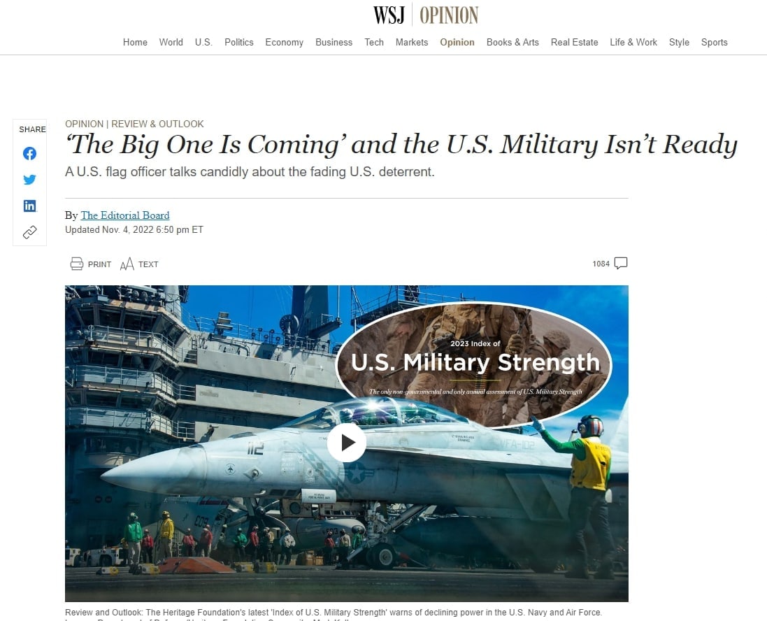 "Я так оцениваю наш уровень сдерживания Китая — корабль медленно тонет. Он тонет медленно, но он тонет, поскольку они размещают свои силы быстрее, чем это делаем мы. По мере того как эта разница увеличивается, не будет иметь значения, насколько хороши наши командиры", отметил генерал.