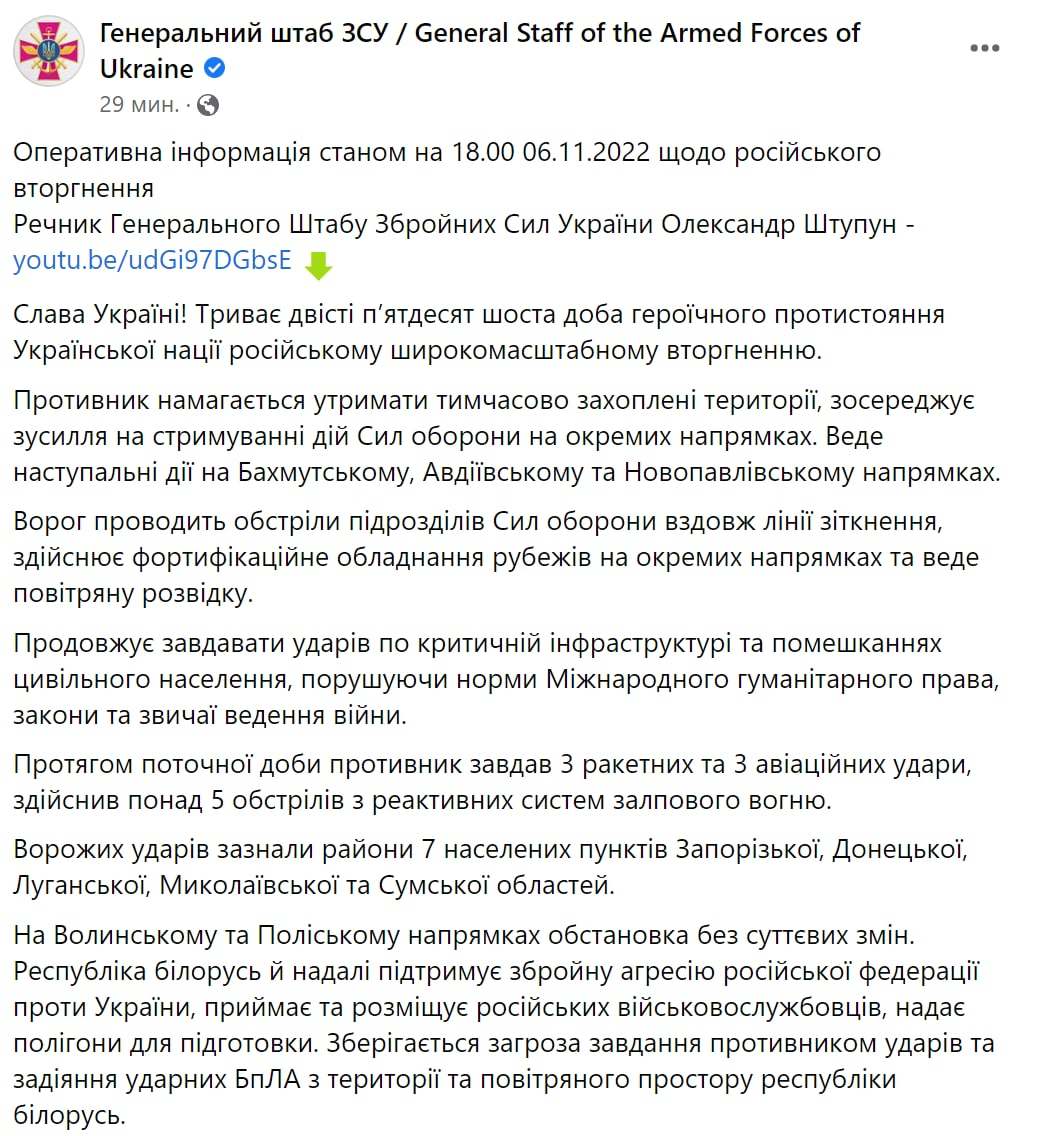 В воскресенье, 6 ноября, в Украине идет уже 256-й день войны с РФ.
