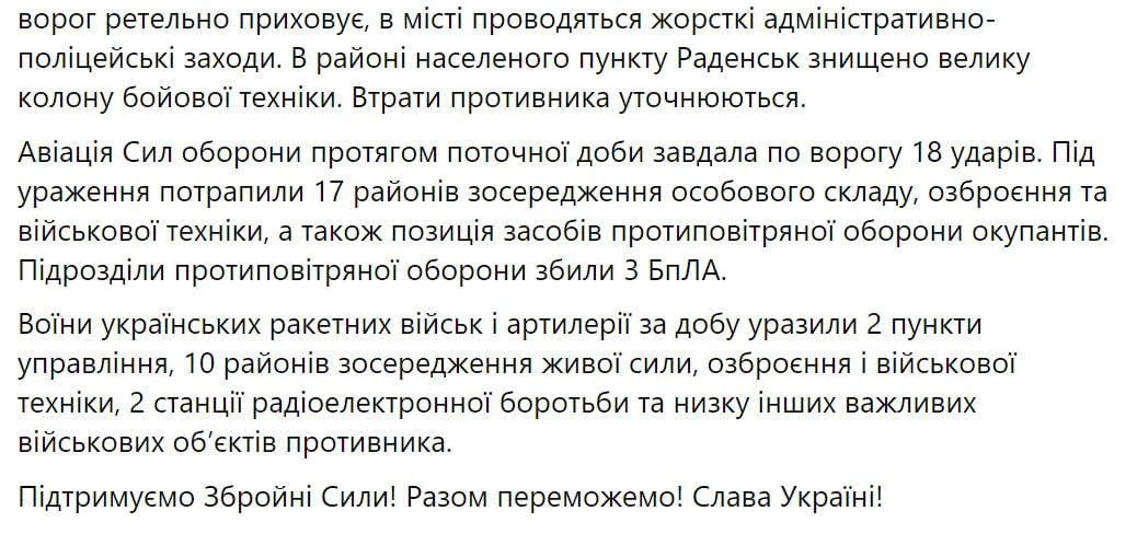 - Противник ведет наступательные действия в Бахмутском, Авдеевском и Новопавловском направлениях. В течение суток противник нанес 3 ракетных и 3 авиационных удара, совершил более 5 обстрелов из реактивных систем залпового огня.