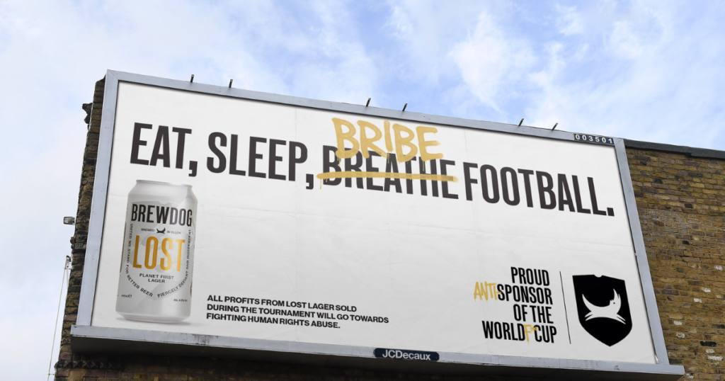 Британская сеть пабов BrewDog объявила себя "гордым антиспонсором" Чемпионата мира по футболу в Катаре, который начнется в ноябре. Она разместила провокационную серию билбордов, протестуя против притеснений прав человека в этой стране.