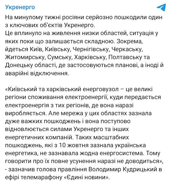 "Киевский и харьковский энергоузел – это большие регионы потребления электроэнергии, куда передается электроэнергия из тех регионов, где она производится. Но сеть в этих областях получила очень тяжелые повреждения", - заявили в "Укрэнерго".