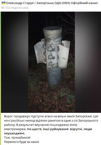 07.45 Этой ночью под обстрел РФ попало одно из сел Запорожского района. В результате была повреждена линия электросетей. Обошлось без пострадавших.