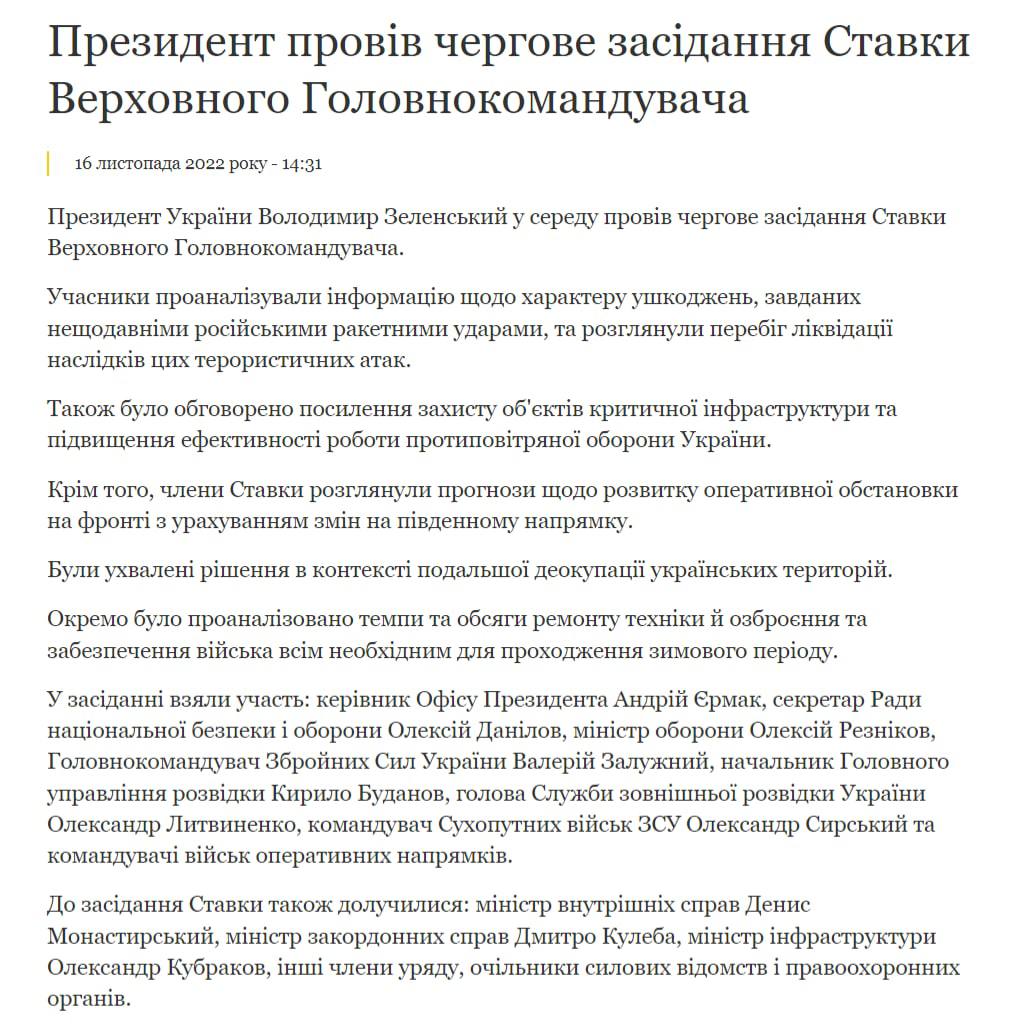 • Сообщил о заседании ставки, где докладывали о восстановлении энергосистемы и ракете, попавшей по Польше.
