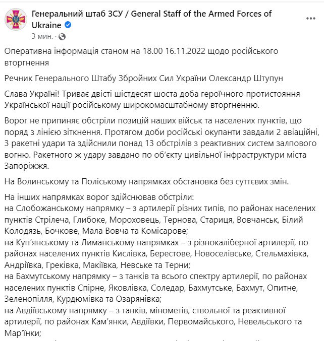 В среду, 16 ноября, идет уже 266-й день со дня полномасштабного вторжения РФ в Украину.