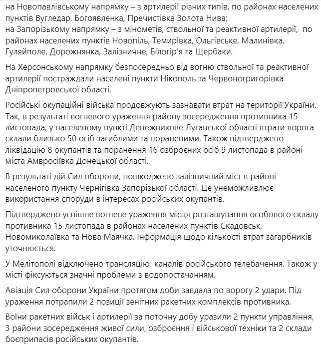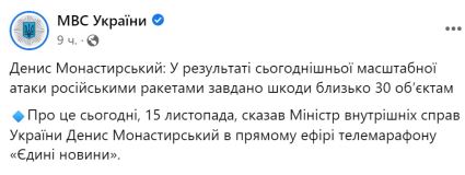 "15 ноября 2022 года произошел очередной многочасовой массированный обстрел всей территории Украины и ее объектов критической инфраструктуры, который вели вооруженные силы Российской Федерации.