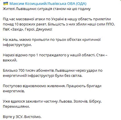 Он написал, что в результате вчерашнего ракетного удара РФ были прилеты по трем объектам критической инфраструктуры. Известно об одном пострадавшем, который находится в тяжелом состоянии.